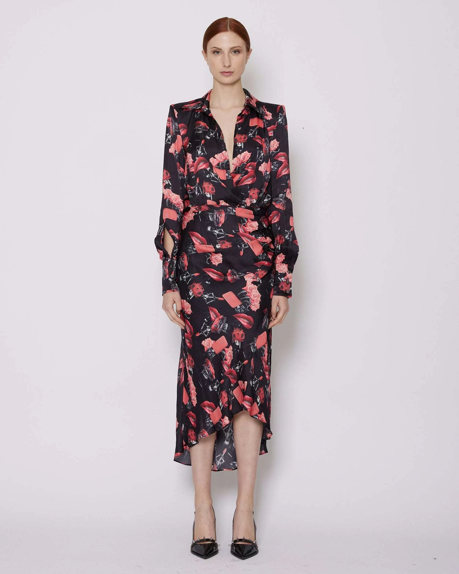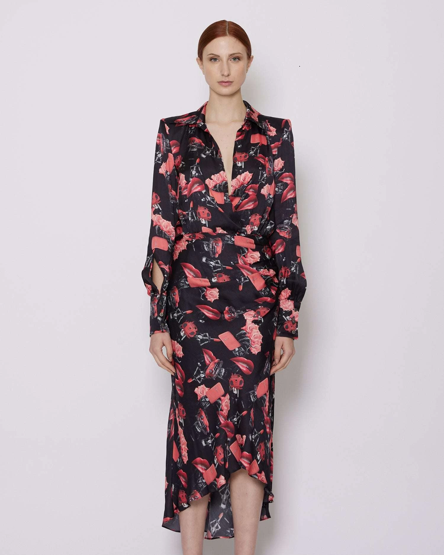 Abito midi a portafoglio con scollo e maniche lunghe leggermente a sbuffo
